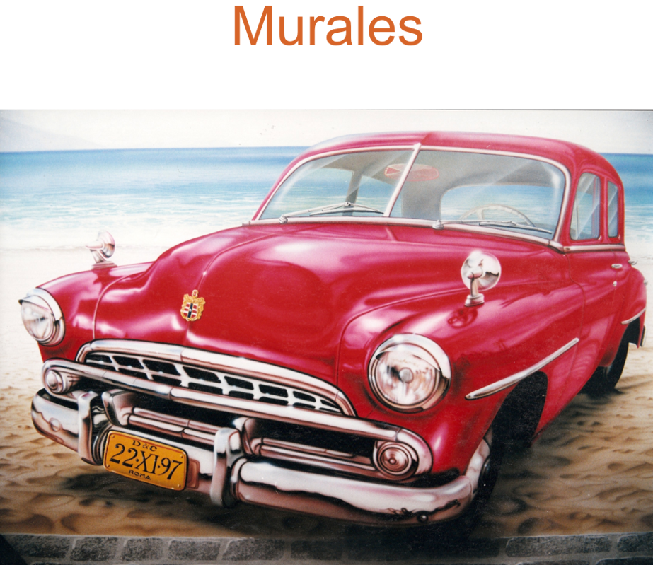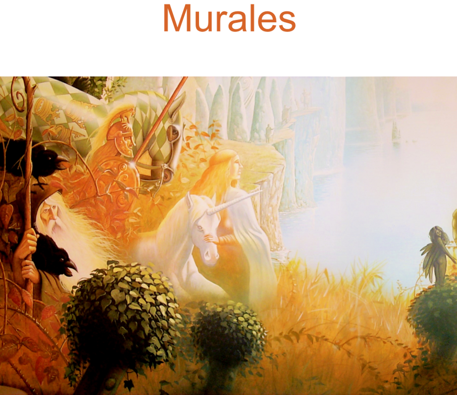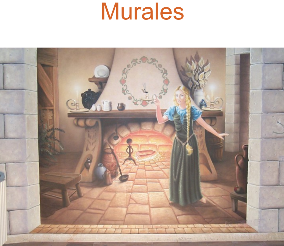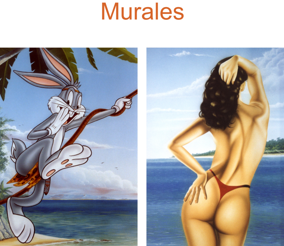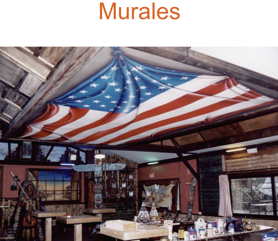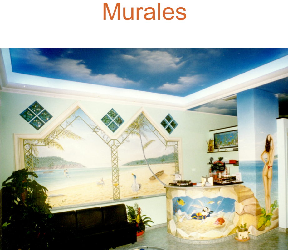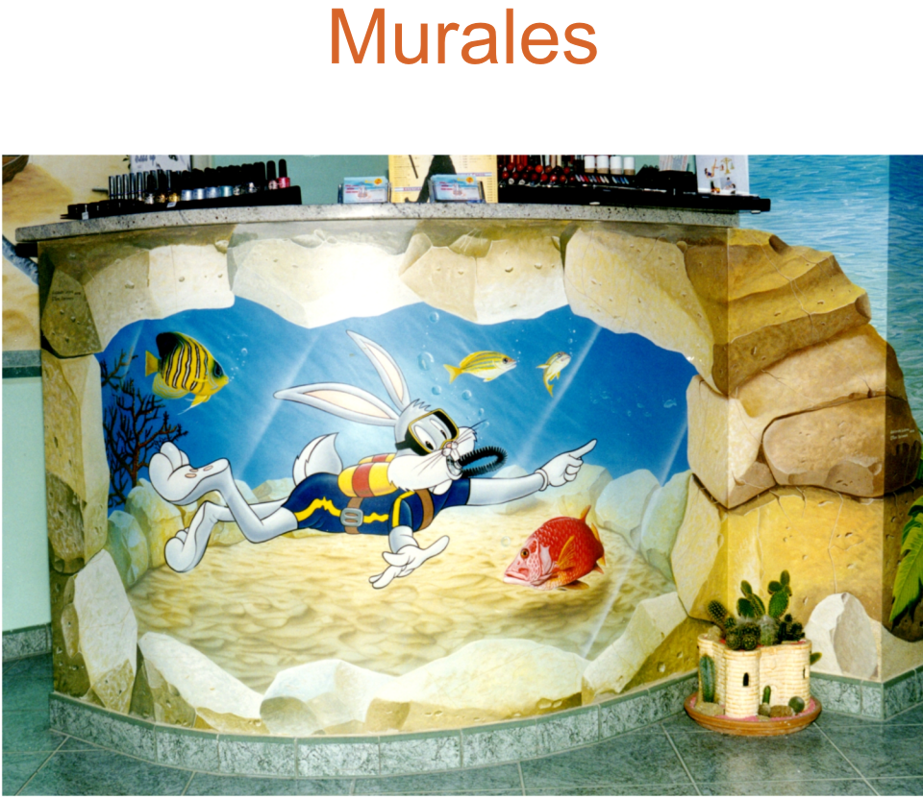 Progettazione e realizzazione di murales con tecnica mista pennello e aerografo su pareti, soffitti, pannelli per attività commerciali o appartamenti.